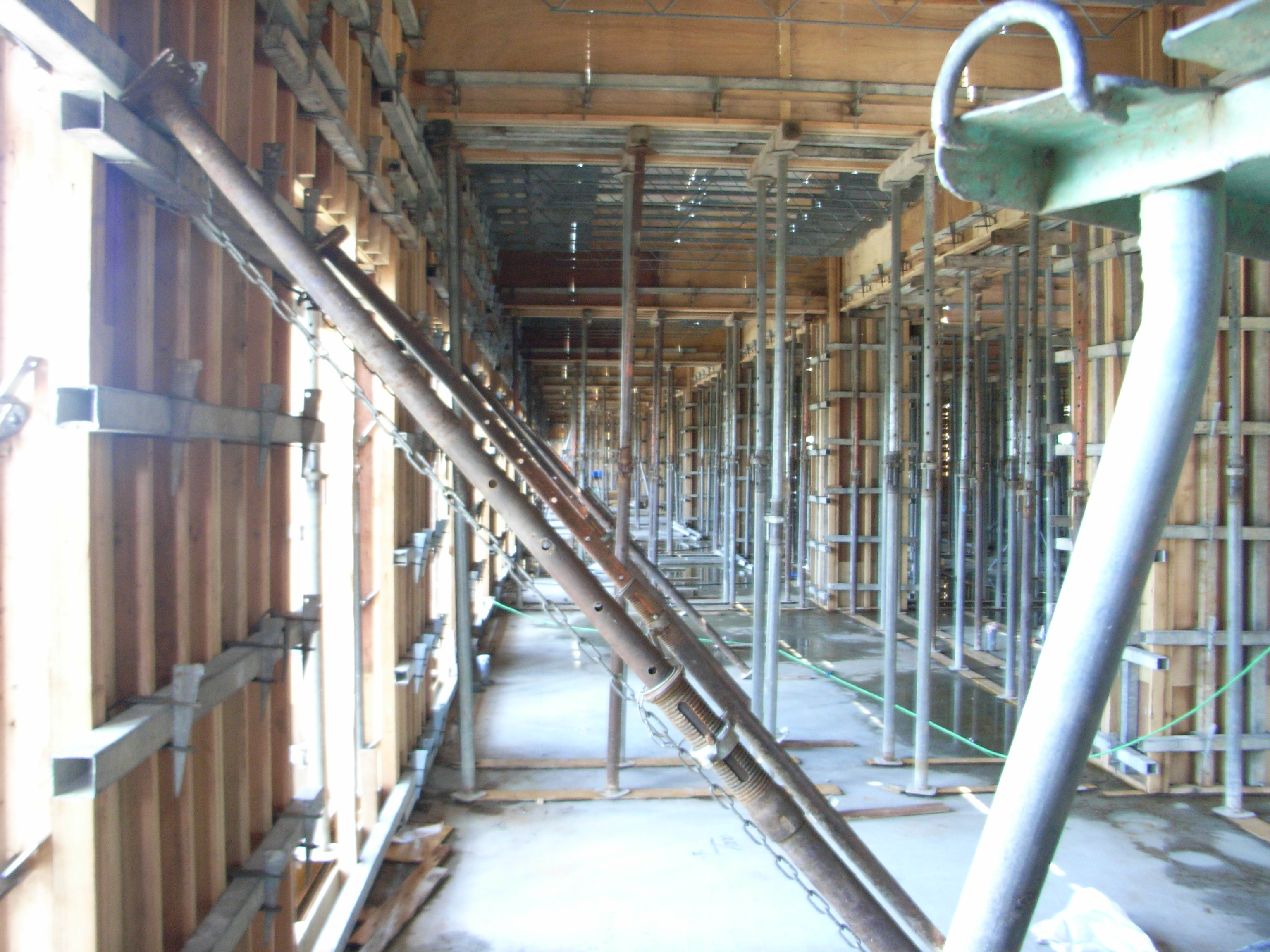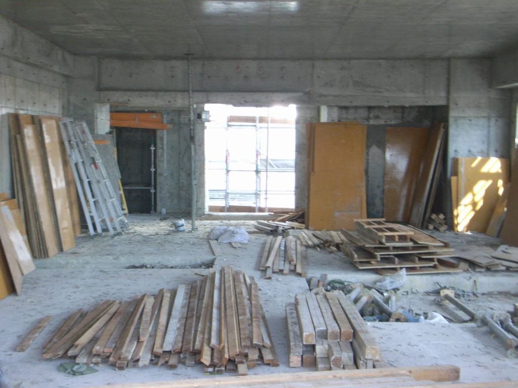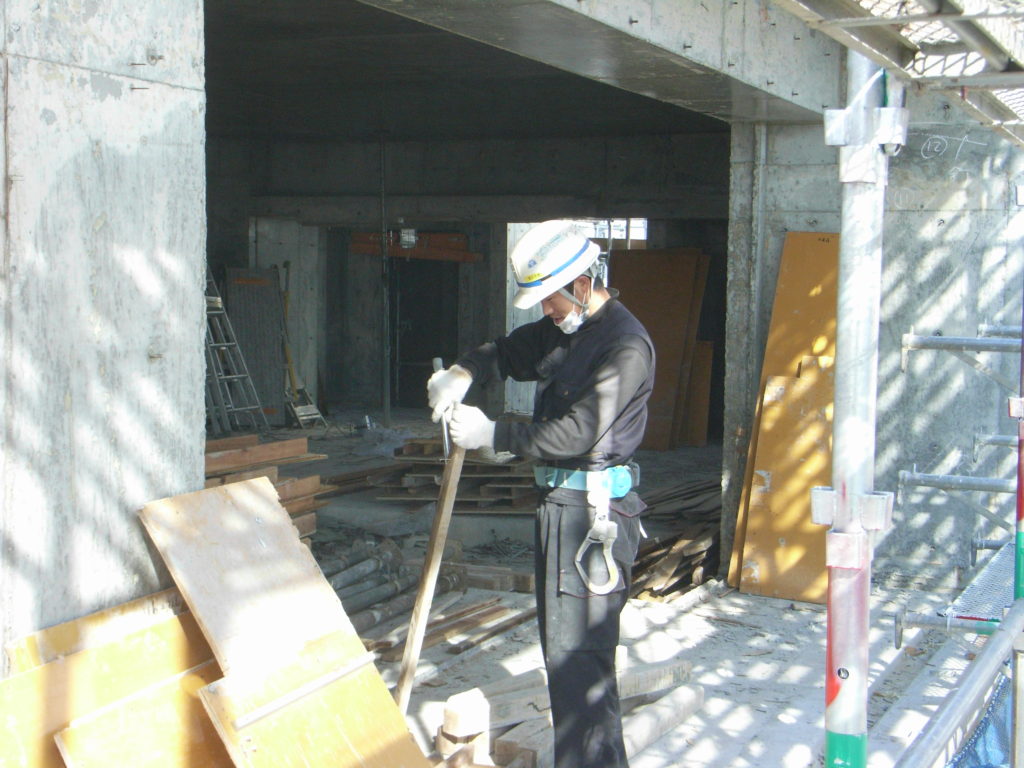 水平つなぎを取る、パイプサポート、大引き、鋼管を外す、梁底解体、スラブ解体、釘仕舞い